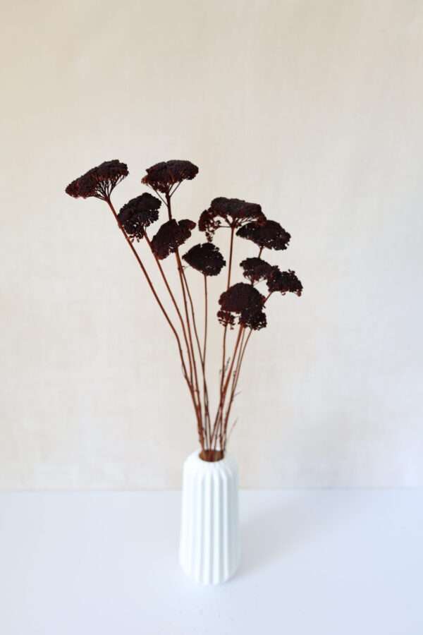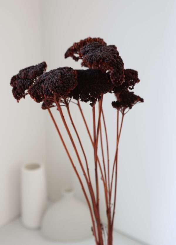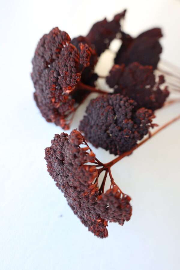 Burnt/Oak Yarrow is also a wonderful addition to arrangements of preserved oak leaves as well as, wheat, rye, oats, rice, and/or any dried grasses. Fill a wreath with green Yarrow and add in a smattering of enhanced pomegranates for a striking and vibrant contrast.