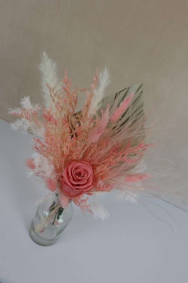 These carefully arranged preserved rose and dried flower arrangements, exclusively designed for indoor use, are perfect for display or gifting. With no need for watering, they will maintain their beauty for over a year, enhancing any indoor space.